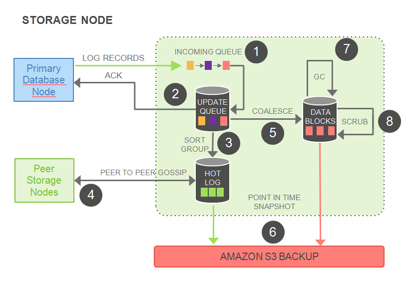 - 보관할 레코드는 핫 로그(hot log)에서 디스크에 저장하고 하나 이상의 로그 시퀀스 번호(LSN)가 누락 된 것으로 판단되면 스토리지 노드는 볼륨의 다른 노드에서 누락 된 LSN을 검색