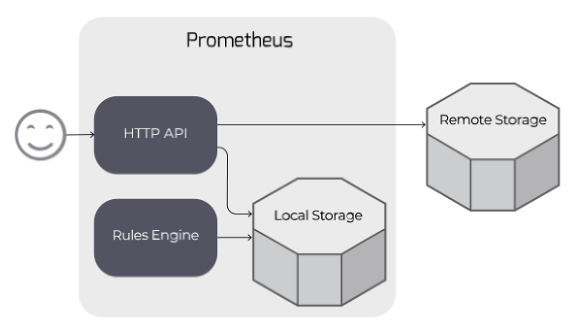 Prometheus 저장소 쿼리가 HTTP API 를 통해 로컬 및 원격 저장소로 전송되고 결과가 병합됩니다.